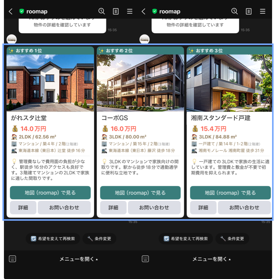 これにより、従来のように複数サイトを行き来して比較する手間を減らし、「LINEで完結する、より気軽な住まい探し体験」を提供します。