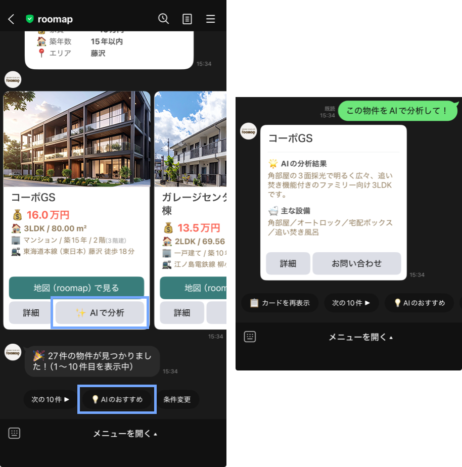 本サービスでは、LINEのトーク画面上で表示される選択肢をタップするだけで条件を絞り込める“対話型検索”を実現。さらに、AIが物件情報を分析し、特徴をわかりやすく整理するほか、検索結果からAIのおすすめ物件を自動で提案します。